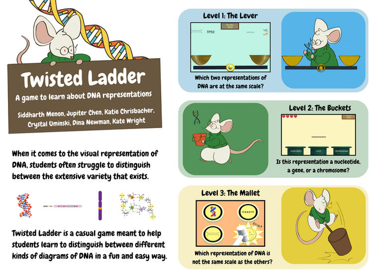 Twisted Ladder is an educational game intended to help college level biology students distinguish between different categories of DNA visualizations based on scale and abstraction. I worked as sole developer to design and build three minigames targeting different methods of distinguishing these diagrams.Roles: Game Design, Game Development